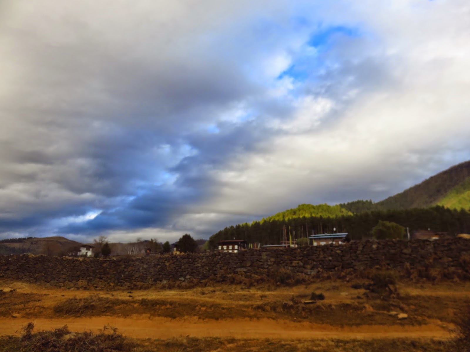 We continue to the Ngelung Drechagling Lhakhang where novice monks are playing soccer and puppies wrestle in the yard. Returning down the hill we find the Gangtey Nature Trail which takes us across to the other side of the valley. The sun is beginning to fall, casting the first golden rays across the brown patchwork fields and illuminating the sky in streaks of white and blue.